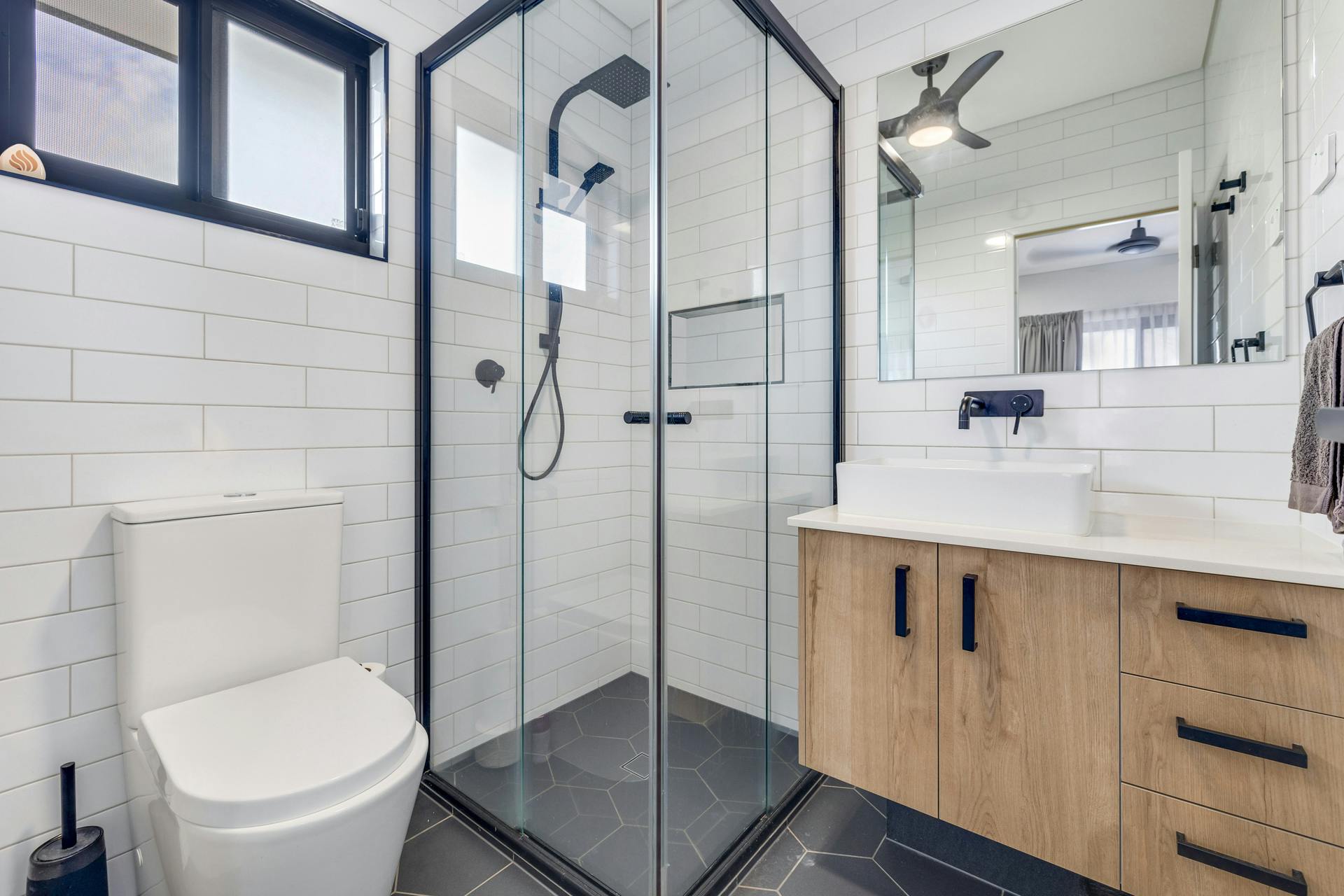 • The kitchen has stunning stone top benches and ample cupboard space.