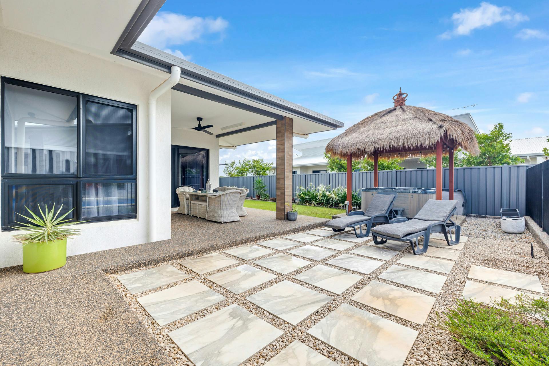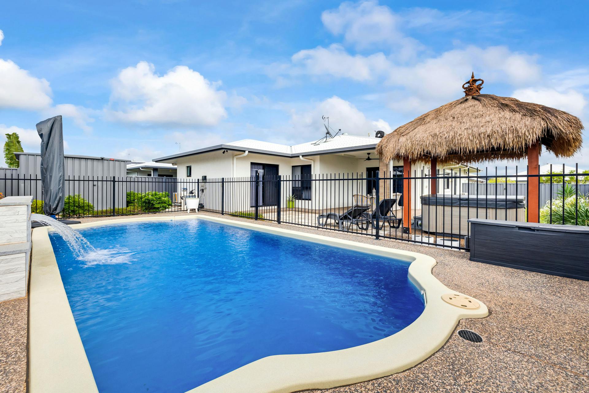 The property offers a Bali hut with above ground spa and a large swimming pool with a water feature, the perfect setting for relaxation and social gatherings.